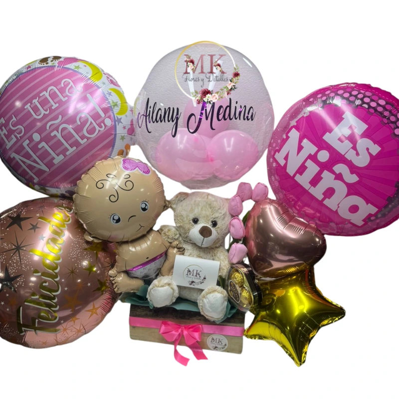 Arreglo de Nacimiento con Tulipanes Eternos, Peluche y Globos