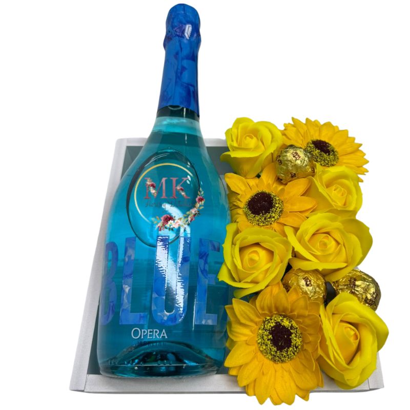 Base con Espumante Blue, Bombones, Girasoles y Rosas Eternas Amarillas