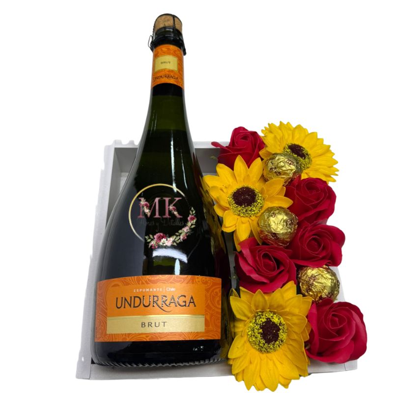 Base con Espumante, Bombones, Girasoles y Rosas Eternas Rojas