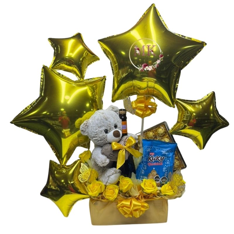 Base con Rosas Eternas, Peluche, Bombones y Globos