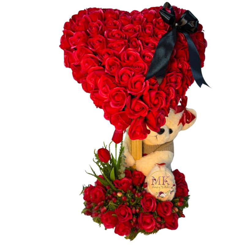 Base Corazón Amor Con Rosas Eternas y Oso de 55cm