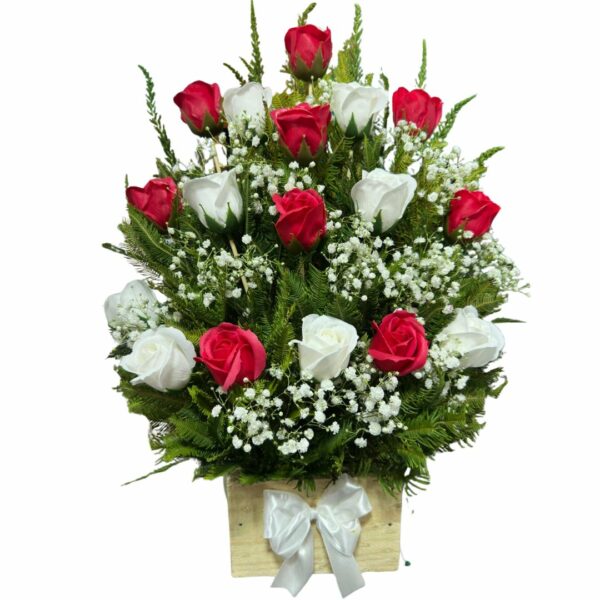 Base de 18 Rosas Blancas y Rojas Eternas