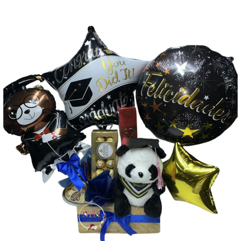 Base de Graduación con Rosas Eternas, Bombones, Peluche y Globos
