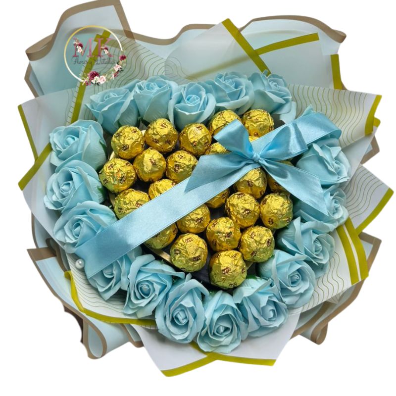 Bouquet Corazón de Rosas Eternas Celeste y Bombones Valente