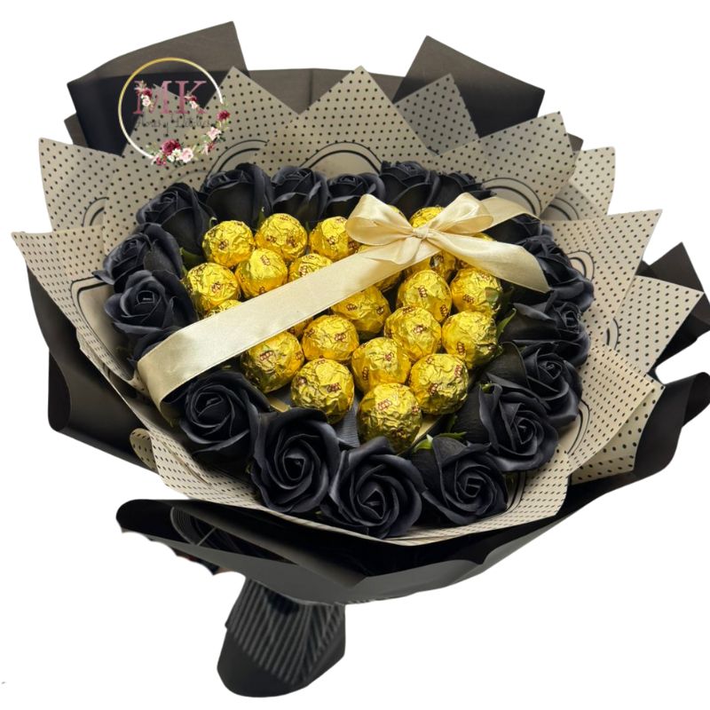 Bouquet Corazón de Rosas Eternas Negras y Bombones Valente