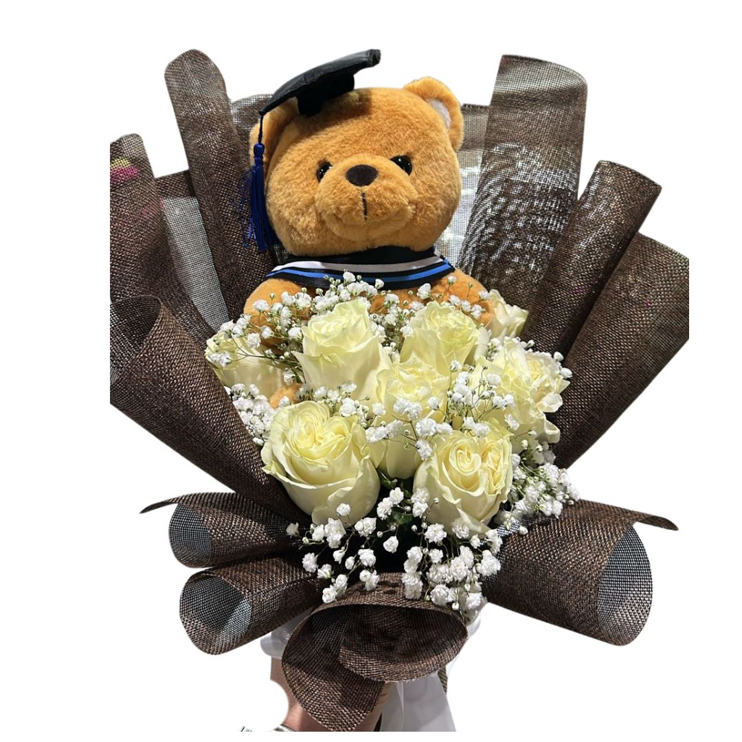 Bouquet de 8 Rosas Blancas y Peluche de Graduación
