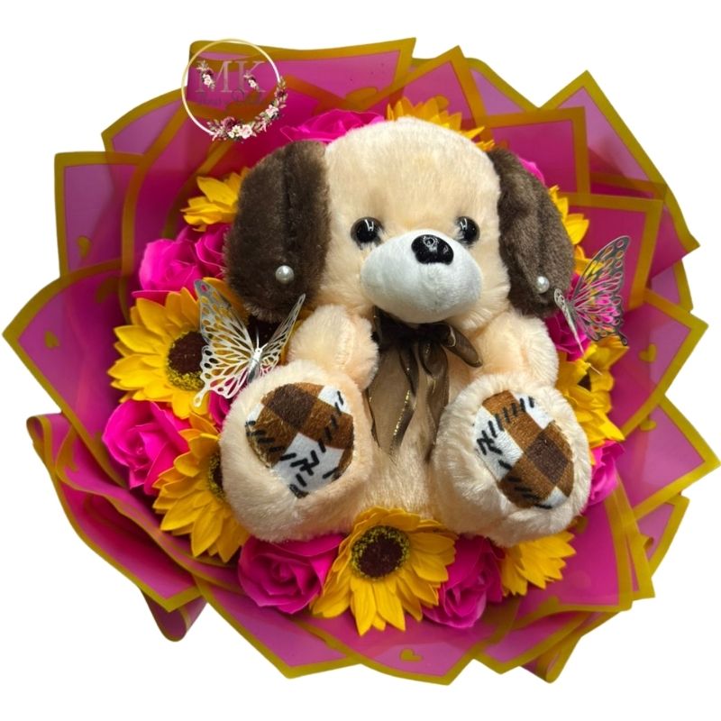 Bouquet de Girasoles y Rosas Eternas con Peluche Perrito