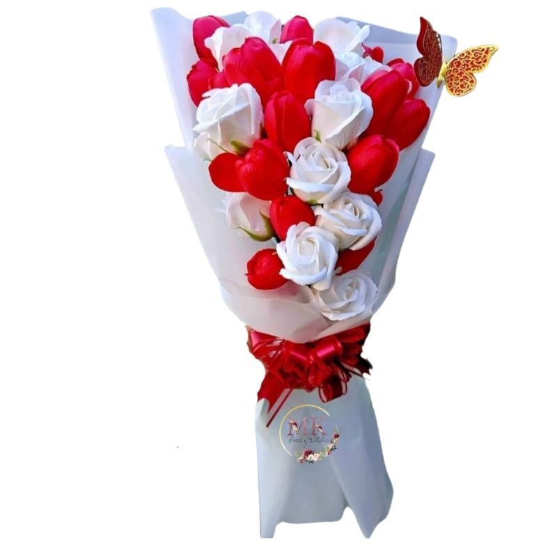 Bouquet de Rosas Blancas y Tulipanes Rojos Eternos