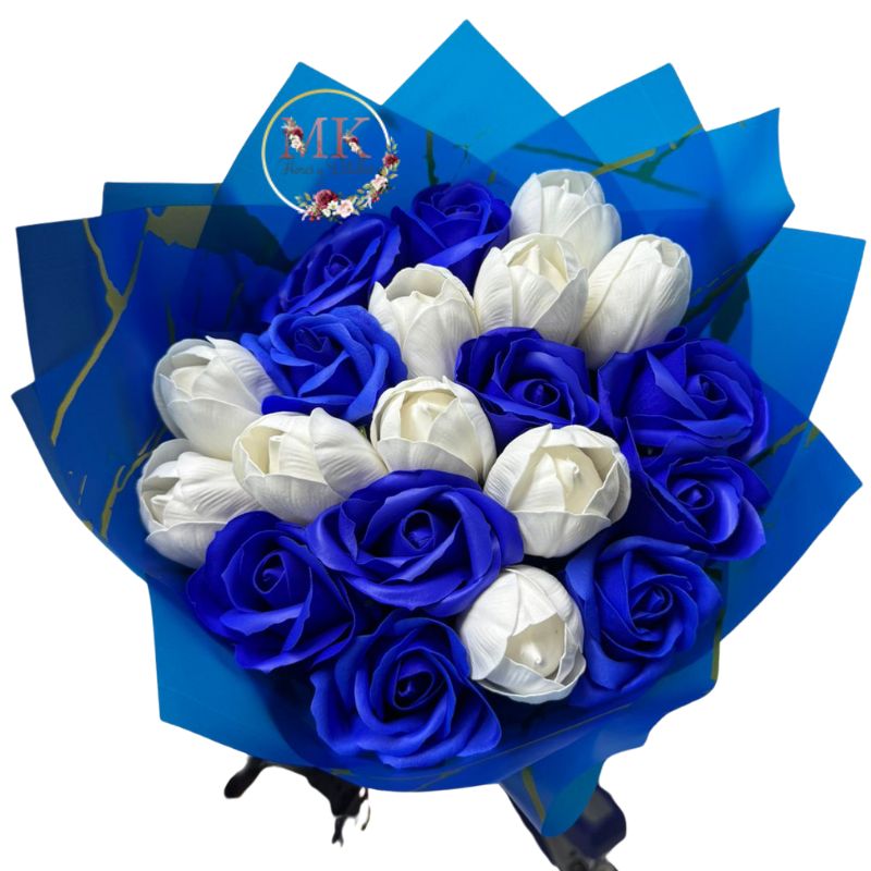 Bouquet de Rosas y Tulipanes Eternos Azul Blanco