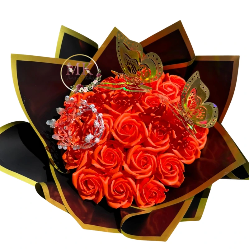 Bouquet de 25 Rosas Naranjas Eternas con Corona y Mariposas