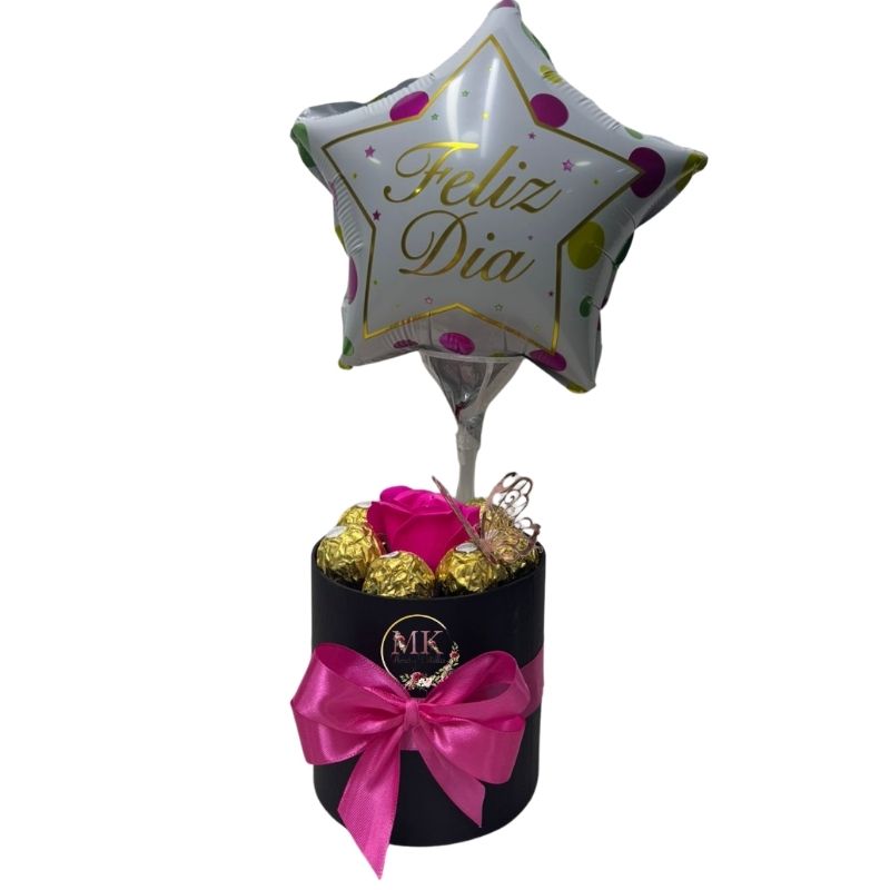 Box Cilindro con Rosa Eterna, Bombones Ferrero Rocher y Globito