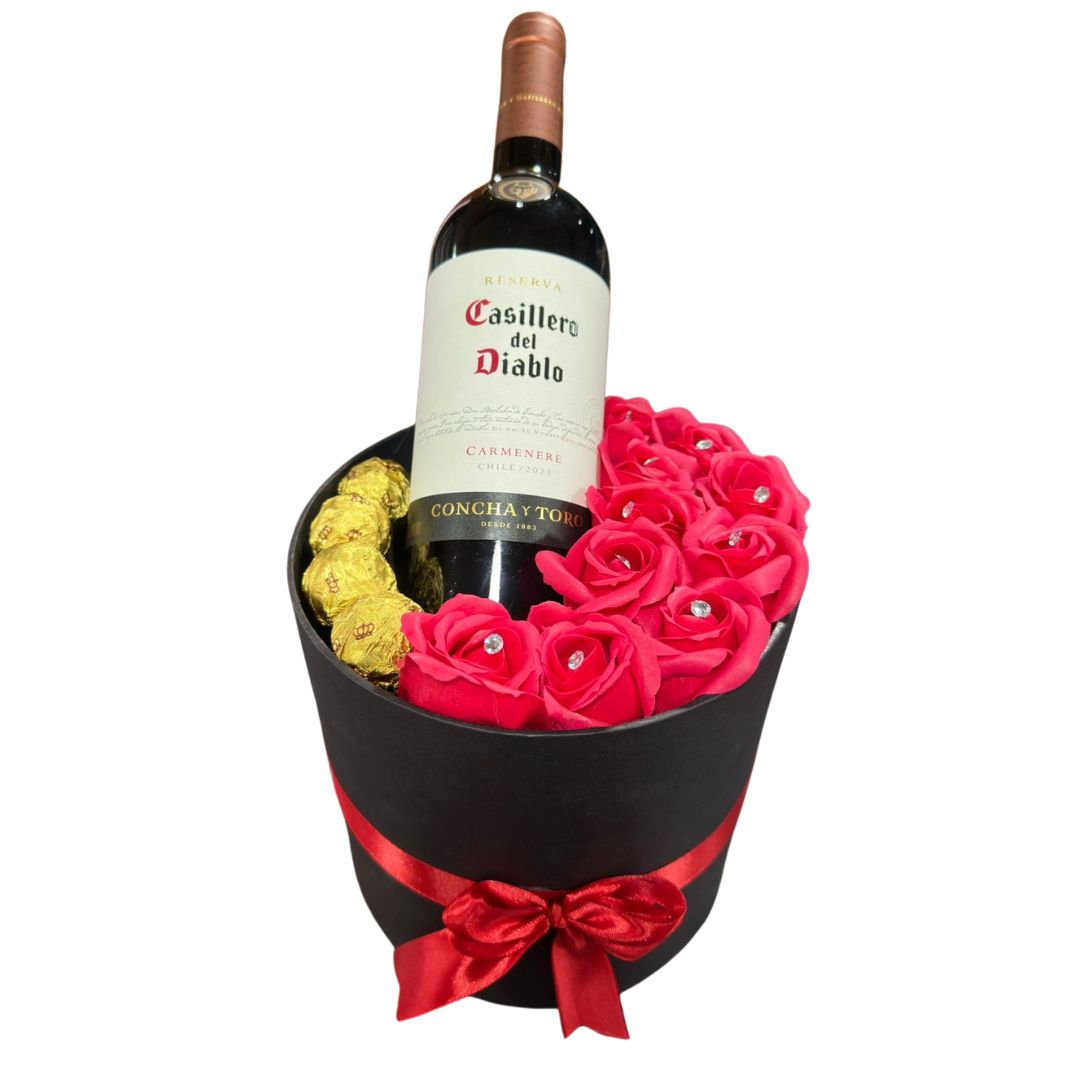 Box Cilindro de 9 Rosas Rojas Eternas, 6 Bombones y Botella de Vino
