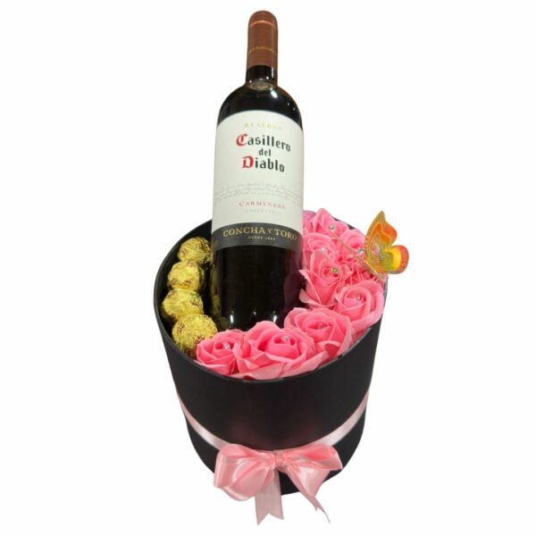 Box Cilindro de 9 Rosas Rosadas Eternas, 6 Bombones y Botella de Vino