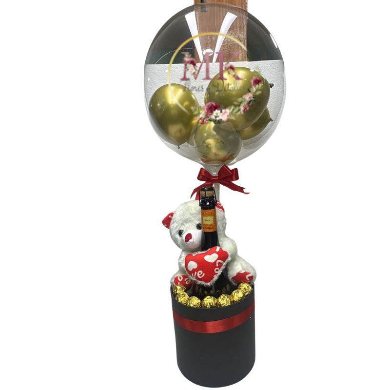 Box con Oso 20cm, Bombones, Espumante y Globo Burbuja