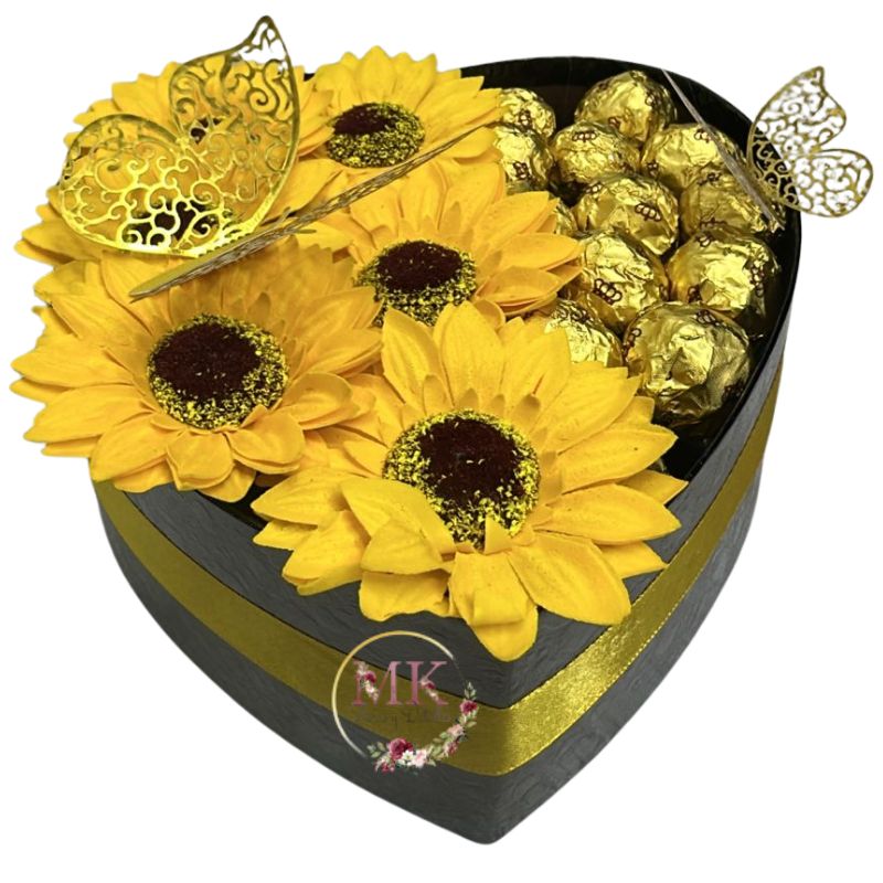 Box Corazón de Girasoles Eternos y 8 Bombones Valente