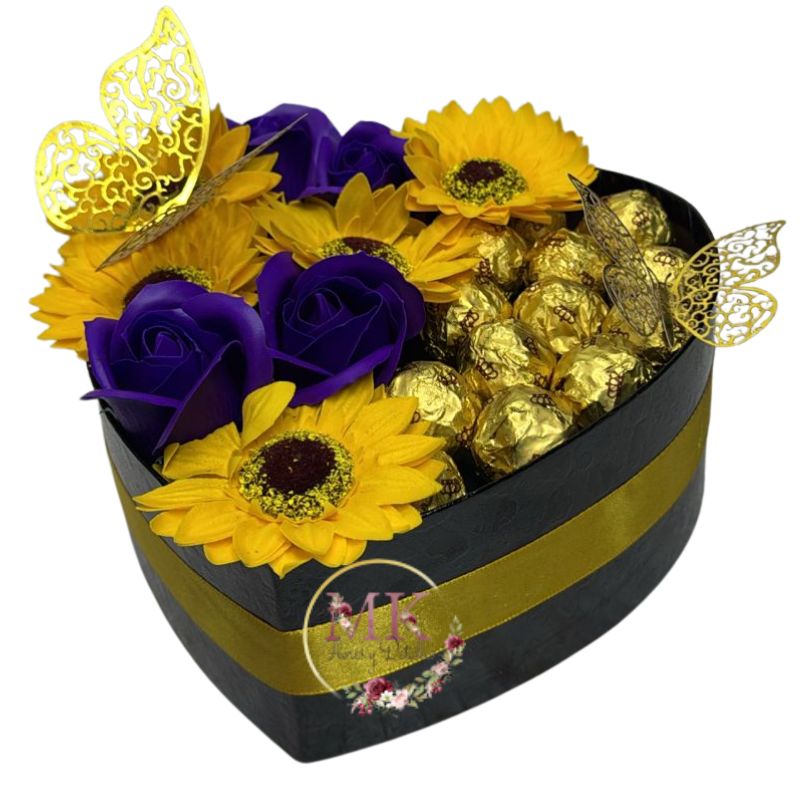 Box Corazón de Girasoles, Rosas Moradas Eternas y 8 Bombones Valente
