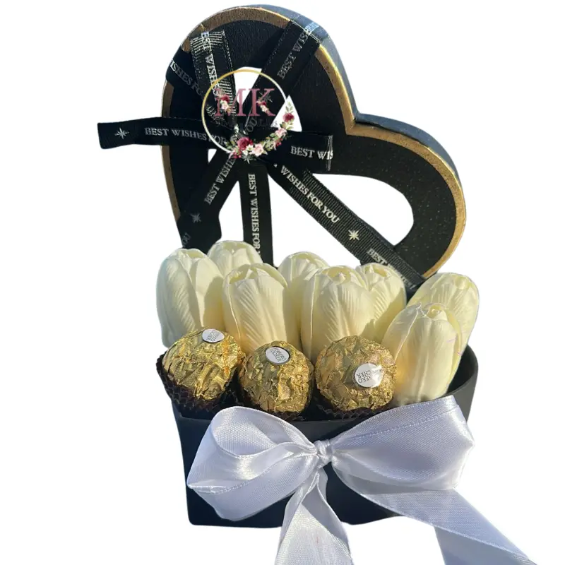 Box Corazón de Tulipanes Eternos Blancos y 3 Bombones Ferrero Rocher