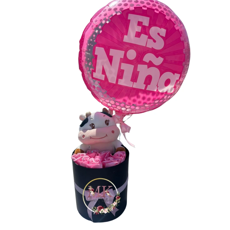 Box de Cilindro de Nacimiento con Rosas Eternas, Peluche y Globo