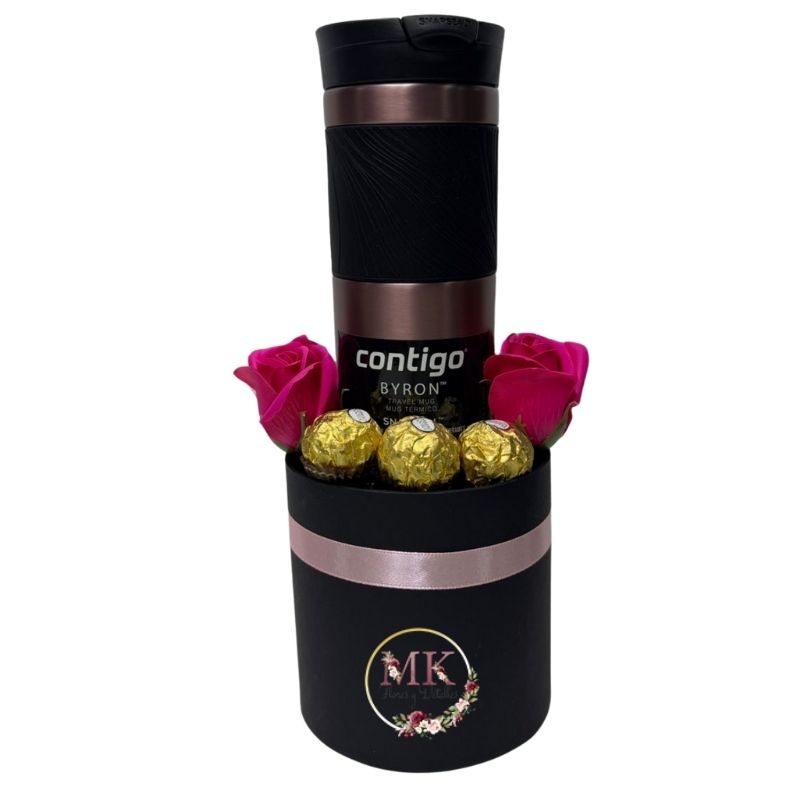 Box Cilindro con Vaso Térmico Contigo, Rosas Eternas y Bombones