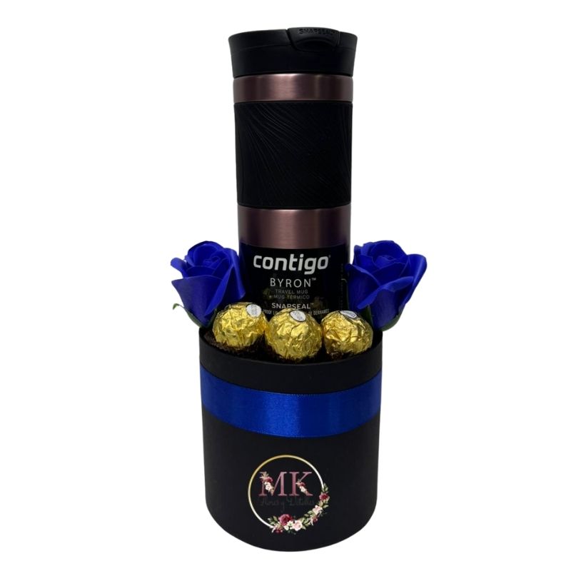 Box Cilindro con Vaso Térmico Contigo, Rosas Eternas y Bombones