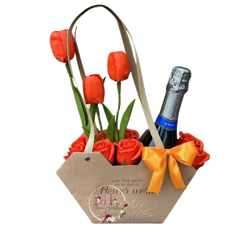 Cartera Hexagonal de Rosas y Tulipanes Eternos con Espumante