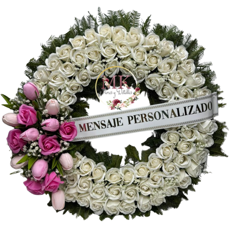 Corona Grande de 100 Rosas Eternas, Flores, Cinta Personalizada y Atril