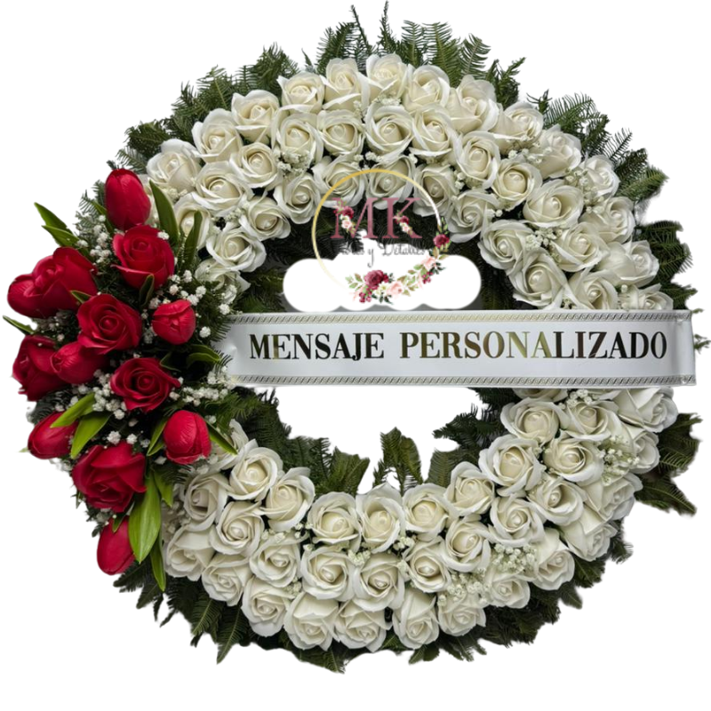 Corona Condolencias de 100 Rosas Eternas, Flores Rojas, Cinta Personalizada y Atril