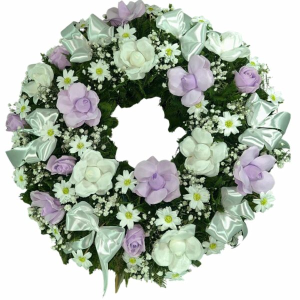 Corona Mediana de Rosas Blancas y Lilas con Atril. 50cm Diámetro