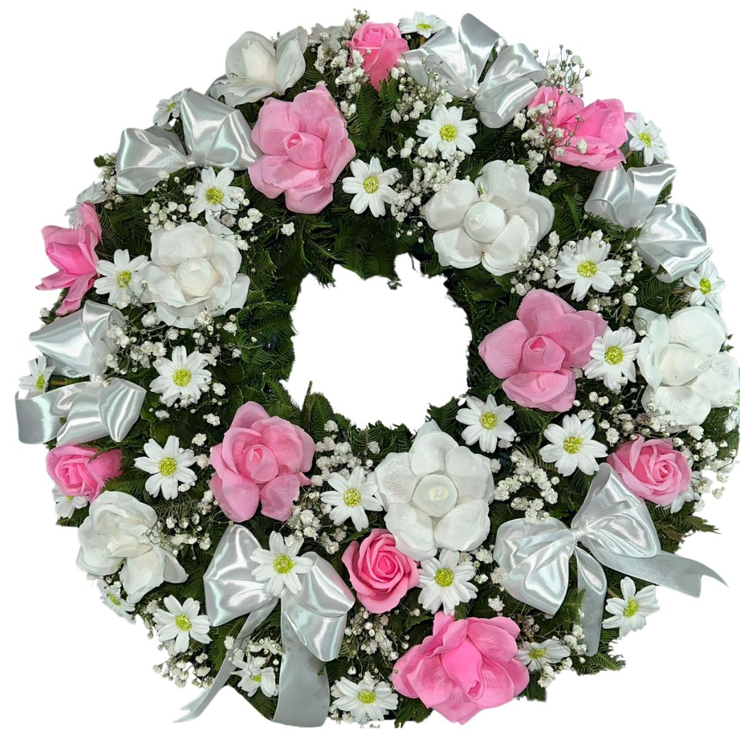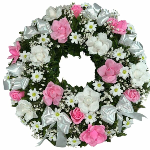 Corona Mediana de Rosas Blancas y Rosadas con Atril. 50cm Diámetro