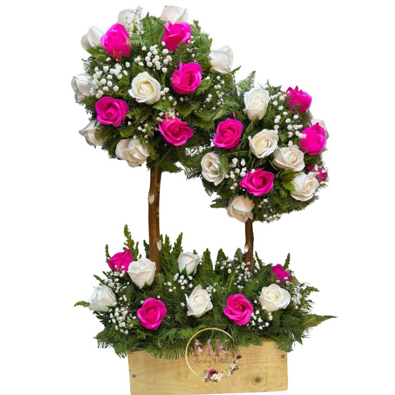Doble Árbol de Condolencias con Rosas Eternas Blancas y Fucsias