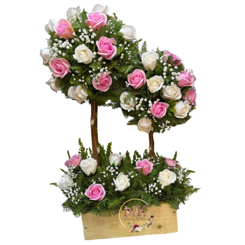 Doble Árbol de Condolencias con Rosas Eternas Blancas y Rosadas