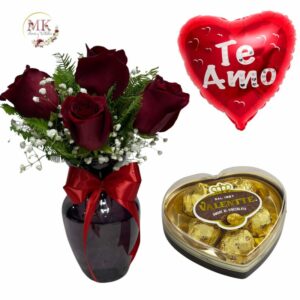 Florero de 4 Rosas Rojas, Bombones Corazón Valente y Globo