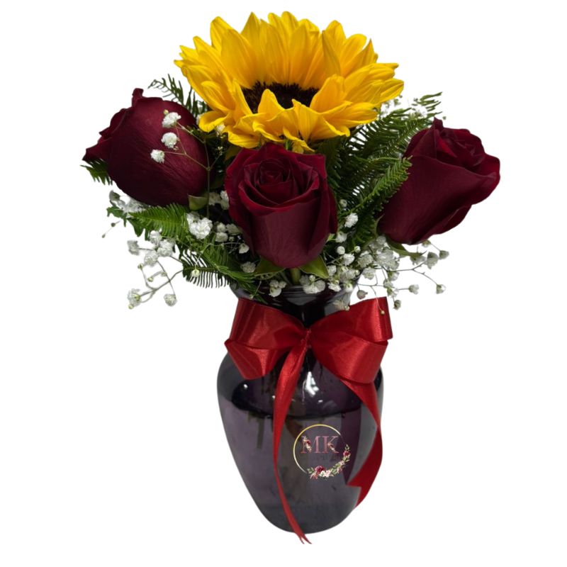 Florero de 4 Rosas Rojas y 1 Girasol con ilusión