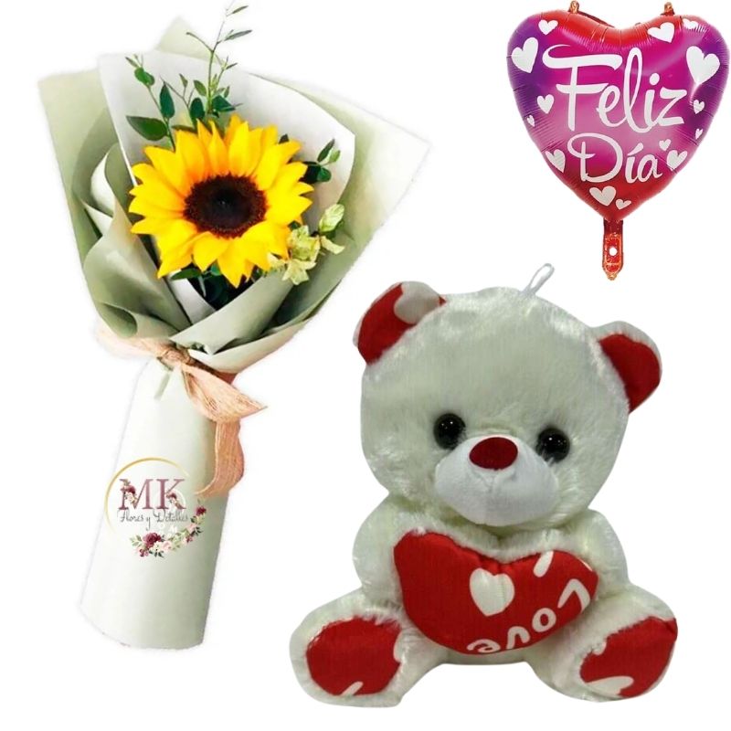 Girasol Decorado, Peluche Oso 20cm y Globo