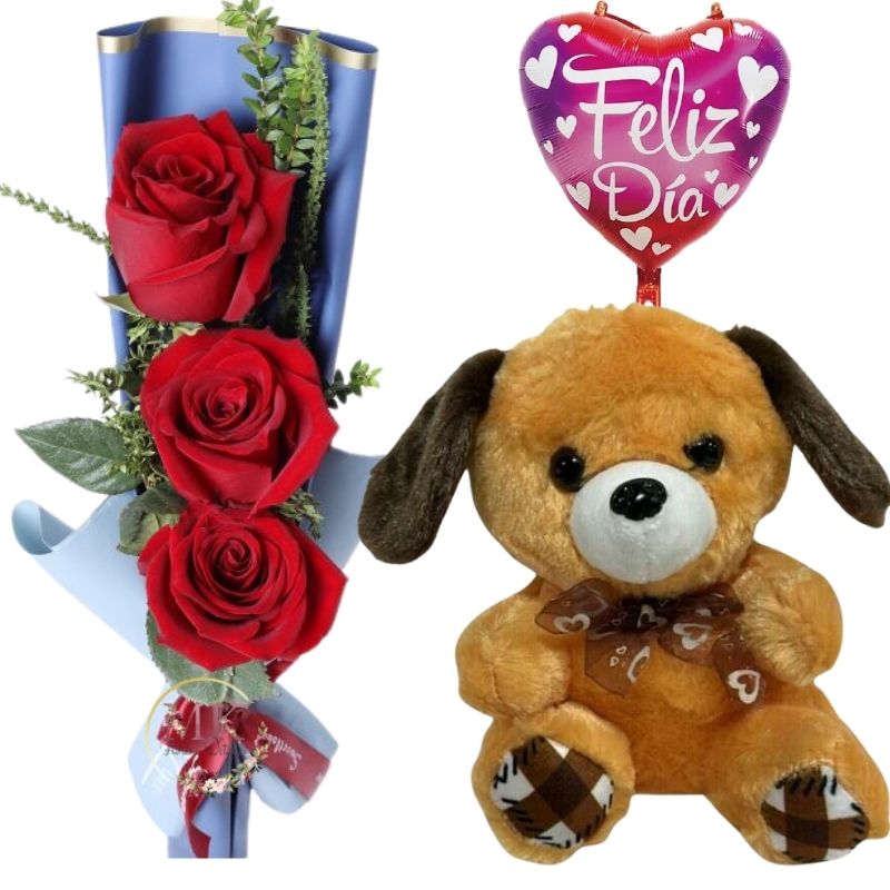 Ramo de 3 Rosas, Peluche Perrito 20cm y Globo