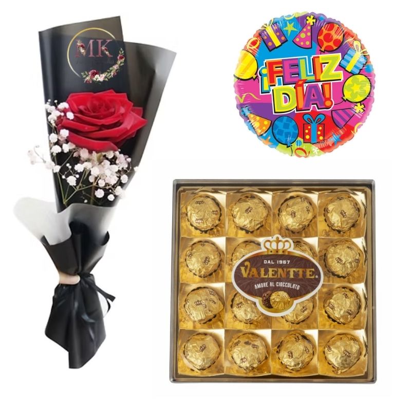 Rosa Decorada, Bombones Valente 200grs y Globo