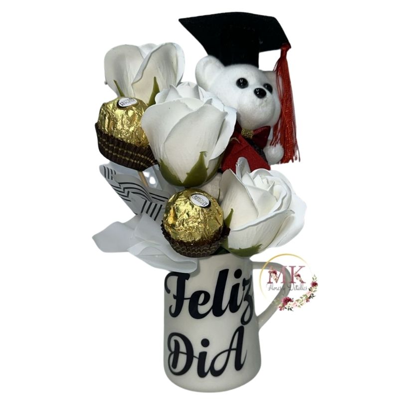 Taza con 3 Rosas Blancas, 2 Bombones Ferrero y Peluchito de Graduación
